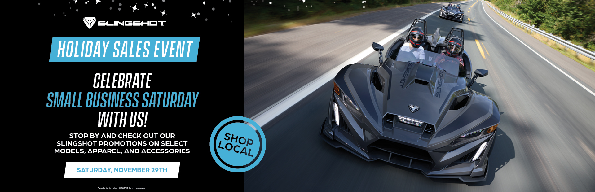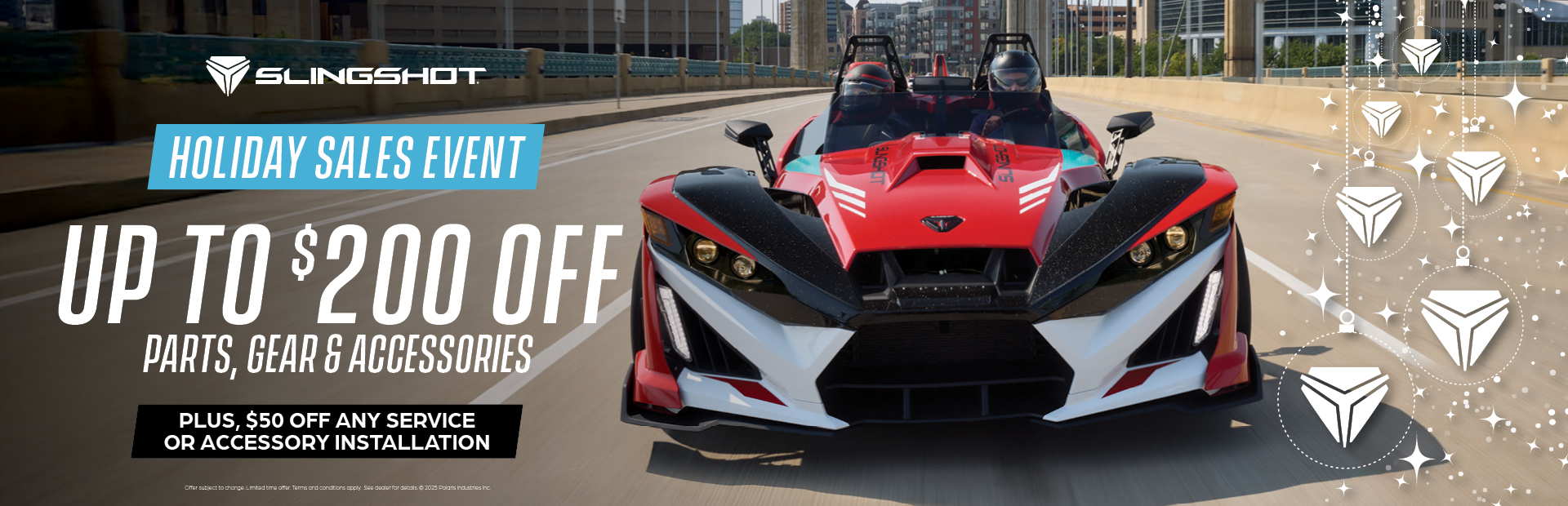 RESTRICTIONS: VALID NOVEMBER 1 – DECEMBER 31, 2025. SPEND $100 (IN LOCAL CURRENCY – USD OR CAD) ON ELIGIBLE SLINGSHOT PARTS, CLOTHING, RIDING GEAR, GENERAL MERCHANDISE & ACCESSORIES AND RECEIVE $20 (IN LOCAL CURRENCY – USD OR CAD) OFF YOUR PURCHASE. SPEND $250 (IN LOCAL CURRENCY – USD OR CAD) ON ELIGIBLE SLINGSHOT PARTS, CLOTHING, RIDING GEAR, GENERAL MERCHANDISE & ACCESSORIES AND RECEIVE $50 (IN LOCAL CURRENTCY – USD OR CAD) OFF YOUR PURCHASE. SPEND $500 (IN LOCAL CURRENCY – USD OR CAD) ON ELGIBILE SLINGSHOT PARTS, CLOTHING, RIDING GEAR, GENERAL MERCHANDISE & ACCESSORIES AND RECEIVE $100 (IN LOCAL CURRENCY – USD OR CAD) OFF YOUR PURCHASE. SPEND $1000 (IN LOCAL CURRENCY - USD OR CAD) ON QUALIFYING SLINGSHOT PARTS, APPAREL AND ACCESSORIES AND RECEIVE $200 (IN LOCAL CURRENCY - USD OR CAD) OFF PURCHASE. RECEIVE $50 (IN LOCAL CURRENCY – USD OR CAD) OFF ANY SERVICE PERFORMED BY AN AUTHORIZED SLINGSHOT DEALER’S SERVICE DEPARTMENT. AT LEAST ONE (1) CURRENT OR CLEARANCE SLINGSHOT PART NUMBER, GARMENT AND/OR ACCESSORY MUST APPEAR ON SERVICE RECEIPT FOR DISCOUNT TO BE APPLIED. APPLICABLE TAX, SHIPPING AND HANDLING FEES DO NOT COUNT TOWARD MINIMUM REQUIRED PURCHASE AMOUNT. DISCOUNT IS APPLIED AFTER APPLICABLE TAX, SHIPPING AND HANDLING FEES ARE ADDED. APPLICABLE TAX, SHIPPING AND HANDLING FEES DO NOT QUALIFY FOR DISCOUNT AND ARE THE RESPONSIBILITY OF THE PURCHASING CONSUMER. LIMIT (1) $50 OFF SERVICE COUPON PER TRANSACTION CAN BE SUBMITTED. OFFER IS VALID ONLINE AT SLINGSHOT.POLARIS.COM AND IN-STORE AT AUTHORIZED SLINGSHOT DEALERS IN CANADA AND THE UNITED STATES. OFFER MAY ONLY BE COMBINED WITH OTHER COUPONS, DISCOUNTS, OFFERS OR PROMOTIONS FOR PARTS, CLOTHING, RIDING GEAR, GENERAL MERCHANDISE, & ACCESSORIES. WHILE SUPPLIES LAST. OFFER HAS NO CASH VALUE AND CANNOT BE APPLIED TO PRIOR TRANSACTIONS. CONDITIONS AND RESTRICTIONS APPLY. FOR THE COMPLETE DETAILS ON THIS OFFER, VISIT SLINGSHOT.POALRIS.COM/EN-US/SPECIAL-OFFERS/