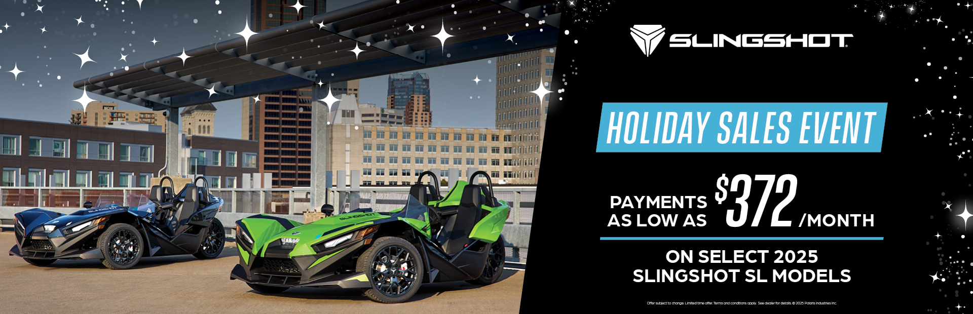 ***2025 Model Year Slingshot Family (excluding S and Slingshot 10) 5.99% APR for 84 Months and $0 Down This is a limited time offer which is valid for the purchase of selected qualifying models and is subject to credit approval on qualified purchases financed during this program. Offer may not be combined with certain other offers, is subject to change and may be extended or terminated without further notice. Offer valid on new 2025 Slingshot® models (excluding S and Slingshot 10). Monthly payment and cost of borrowing will vary depending on amount borrowed and down payment/trade. Minimum amount to finance is $5,000. Example: $28,299 financed at 5.99% APR over 84 months = 84 monthly payments of $372; financed amount of $25,469 with $2,830 down payment, total cost of borrowing of $5,774 and a total obligation of $31,243. An example of monthly payments required on an 84-month term at 5.99% APR is $14.60 per $1,000 financed. Monthly payment examples assume 10% down and do not include taxes, title, and other fees. Offer only valid to qualified customers, not all customers will qualify, other offers available, see dealer for details. Offer Valid: November 1 – December 31, 2025. "